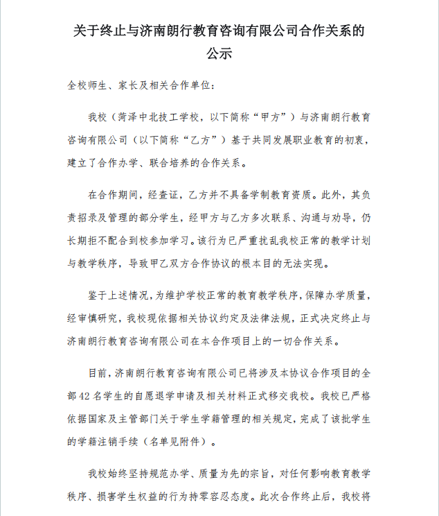 关于终止与济南朗行教育咨询有限公司合作关系的公示