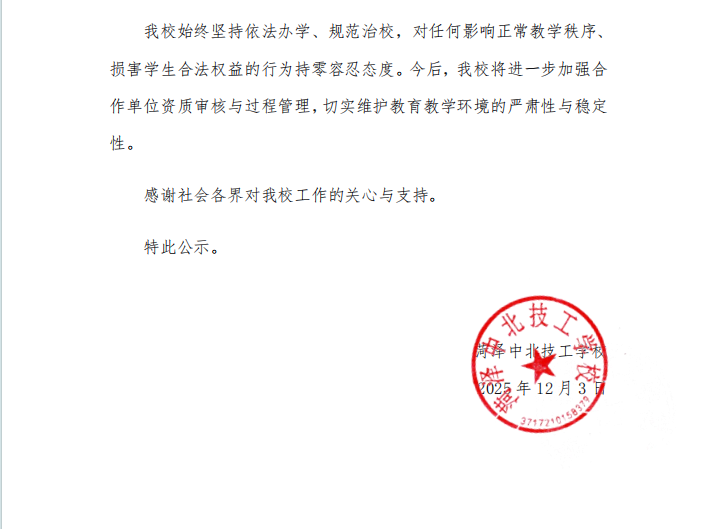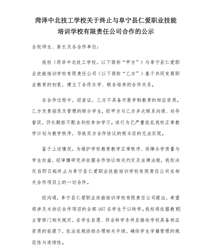 菏泽中北技工学校关于终止与阜宁县仁爱职业技能培训学校有限责任公司合作的公示